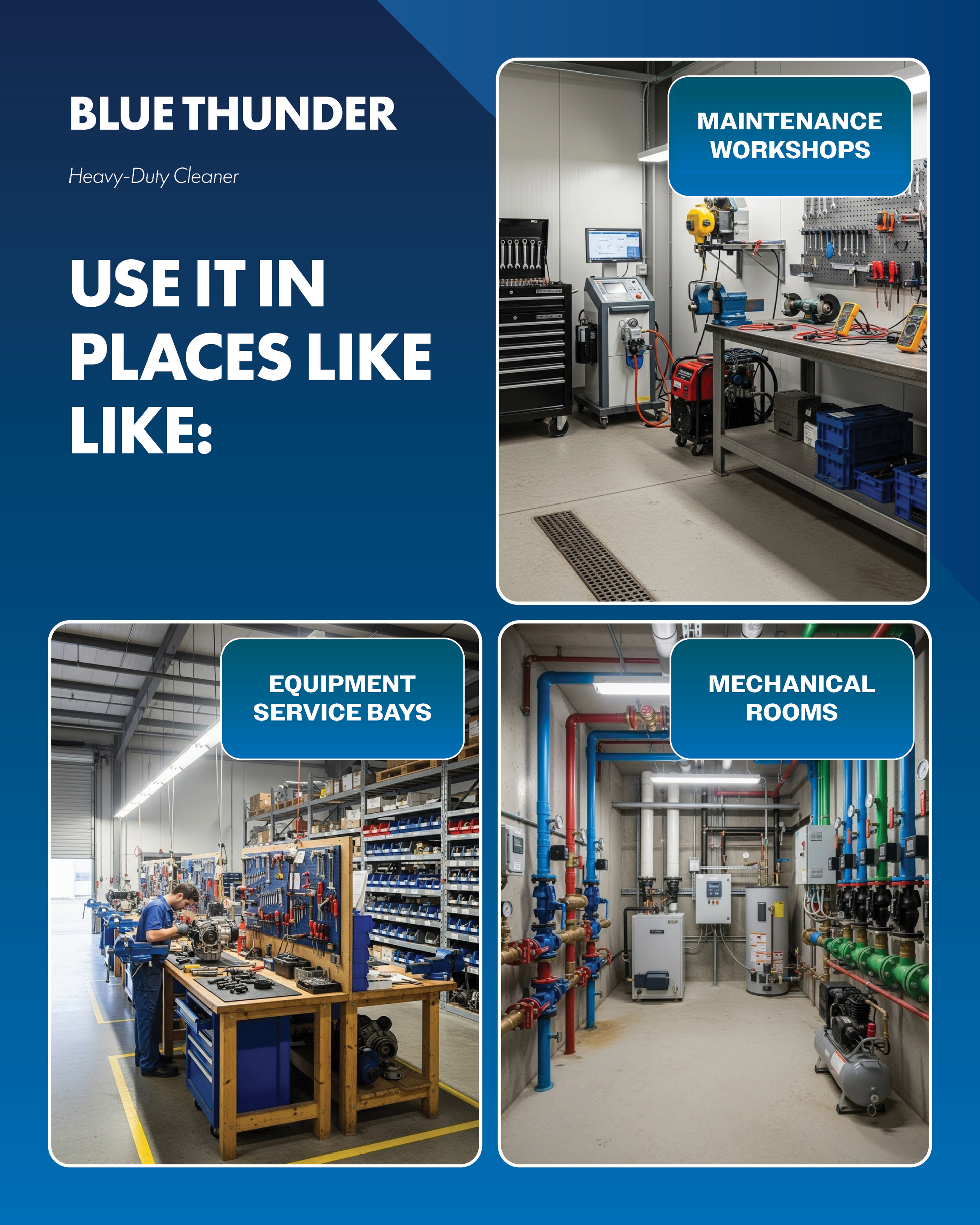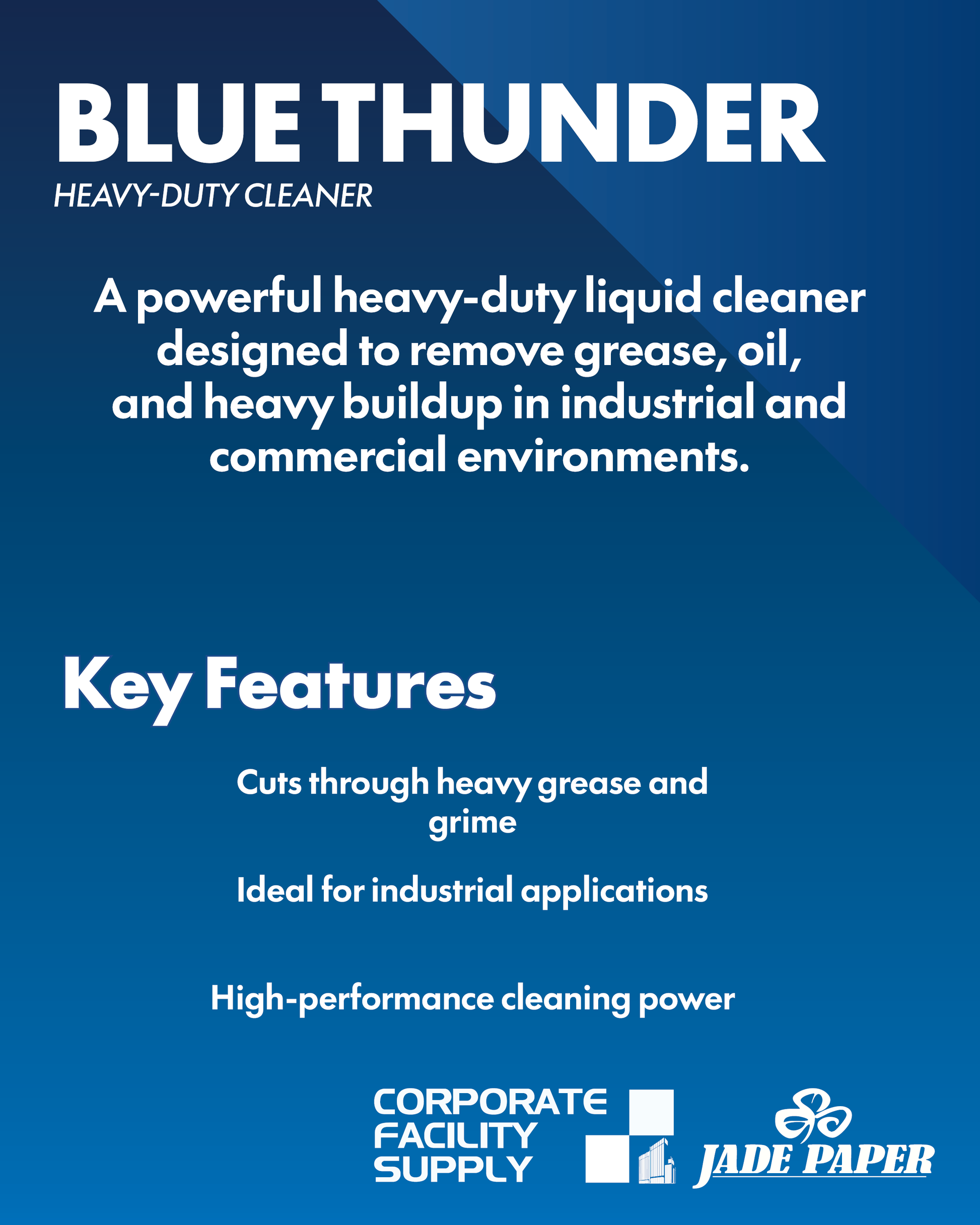 Blue Thunder is a powerful heavy-duty cleaner designed for industrial and commercial environments where tough soils demand strong performance. Its alkaline formula penetrates grease, oil, and stubborn dirt, delivering a deep clean for floors, equipment, and hard surfaces. With a high pH of 12.5–13.2 and active ingredients like sodium hydroxide and sodium metasilicate, Blue Thunder is engineered for maximum cleaning strength and reliability in demanding conditions.