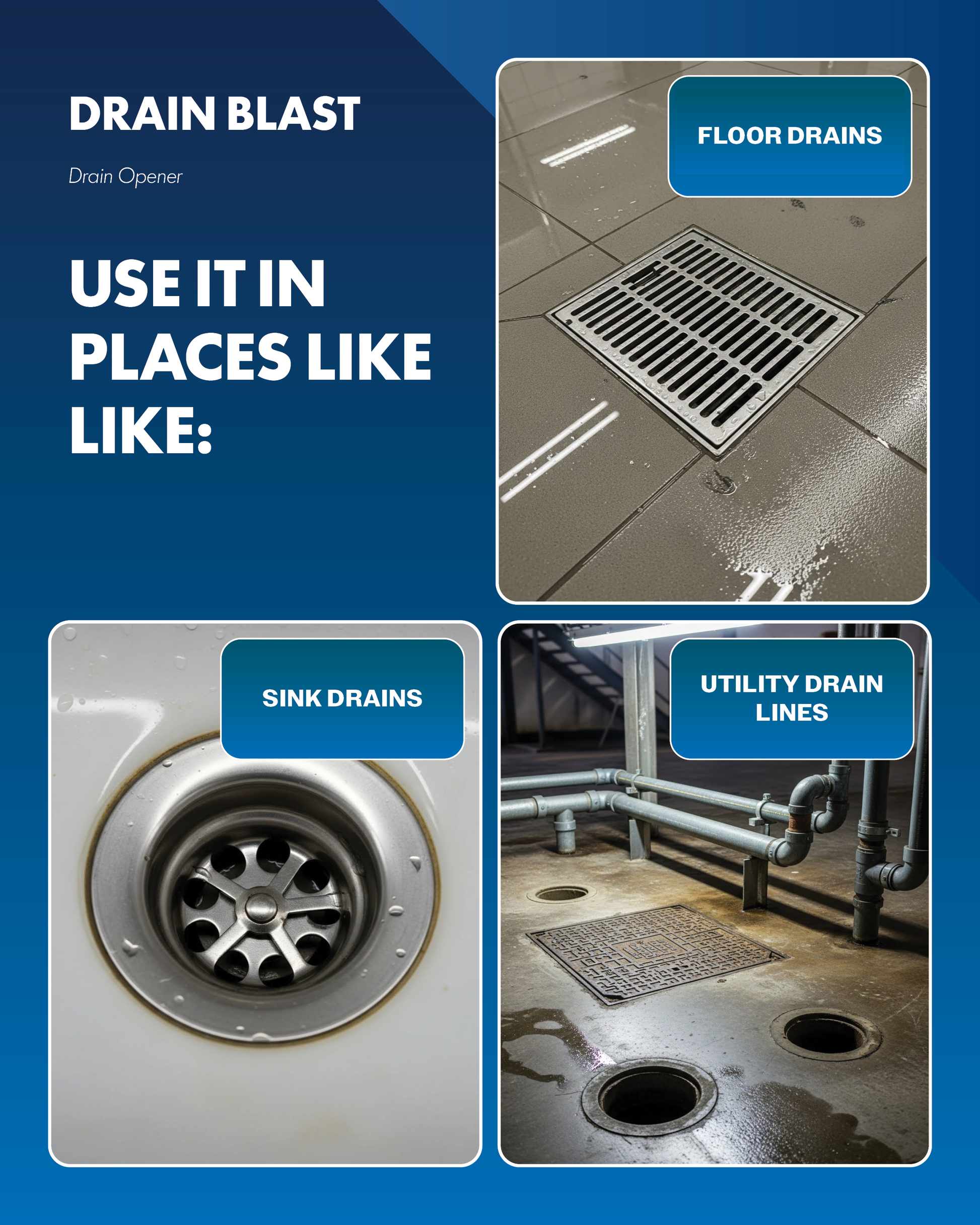 Drain Blast is a professional-grade drain opener formulated to dissolve and remove blockages caused by grease, hair, soap scum, and organic buildup. Its fast-acting liquid penetrates deep into drain lines to restore proper flow and eliminate foul odors. Designed for industrial, commercial, and institutional use, Drain Blast delivers powerful results without the need for mechanical cleaning tools. Safe for use in metal and PVC plumbing when used as directed.