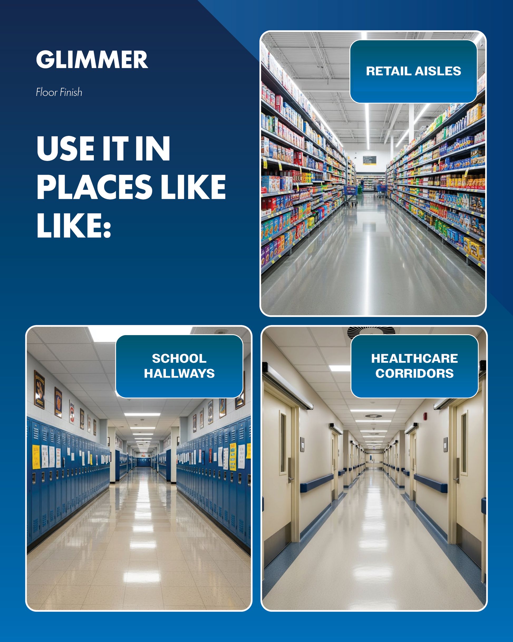Glimmer is a high-performance acrylic floor finish designed to deliver a rich, durable gloss with excellent scuff and black-mark resistance. Its self-sealing, quick-dry formula levels evenly, builds shine in fewer coats, and withstands daily traffic and repeated maintenance. Compatible with low-speed spray buffing and UHS burnishing, Glimmer keeps floors looking freshly finished while simplifying ongoing care.