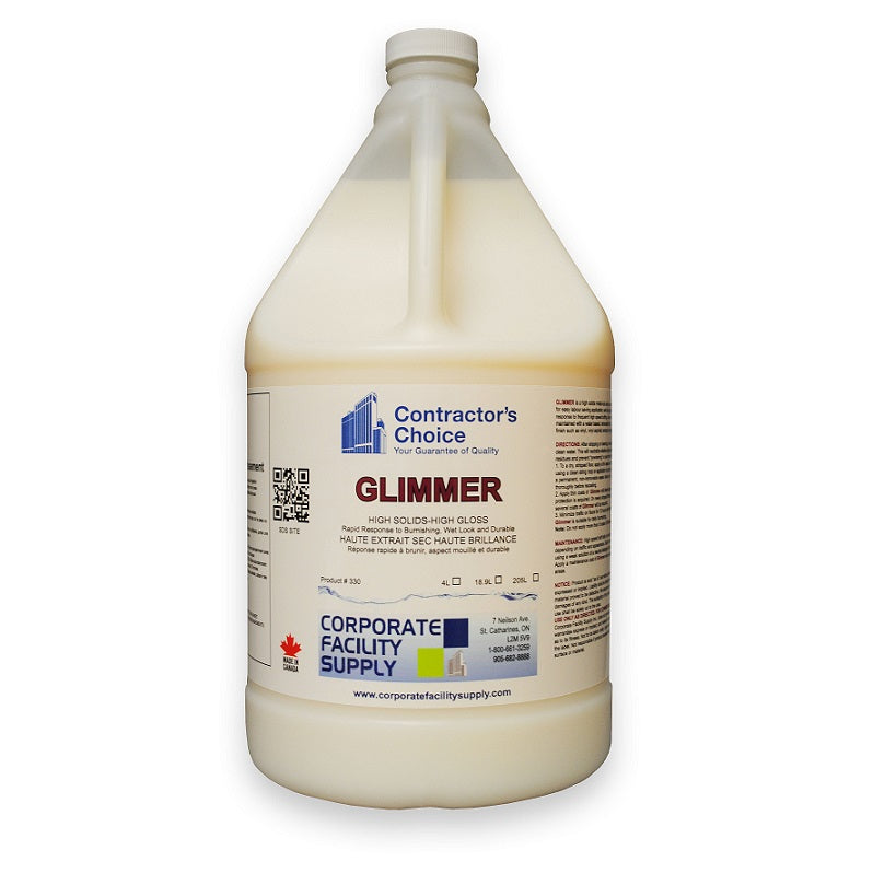 Glimmer is a high-performance acrylic floor finish designed to deliver a rich, durable gloss with excellent scuff and black-mark resistance. Its self-sealing, quick-dry formula levels evenly, builds shine in fewer coats, and withstands daily traffic and repeated maintenance. Compatible with low-speed spray buffing and UHS burnishing, Glimmer keeps floors looking freshly finished while simplifying ongoing care.