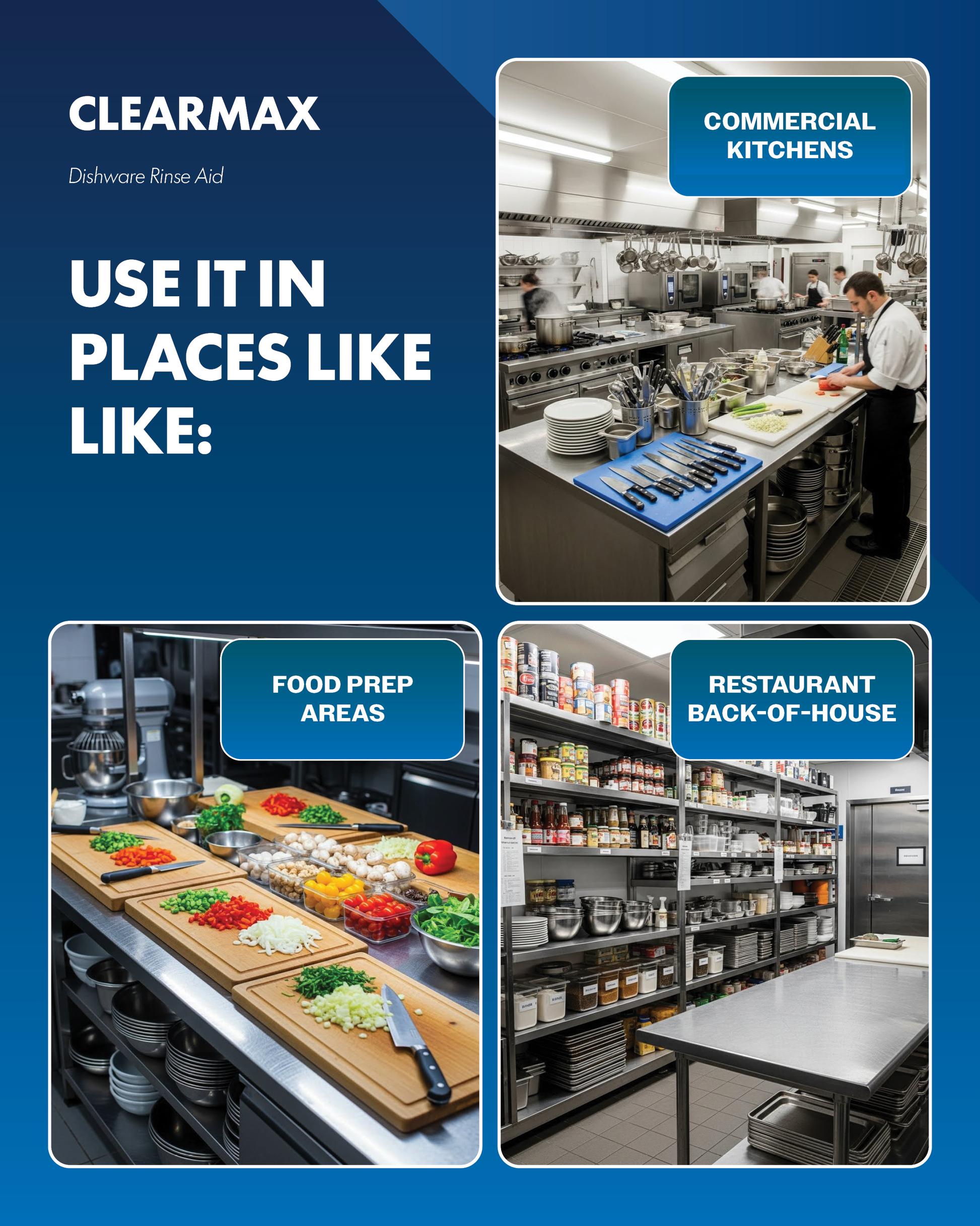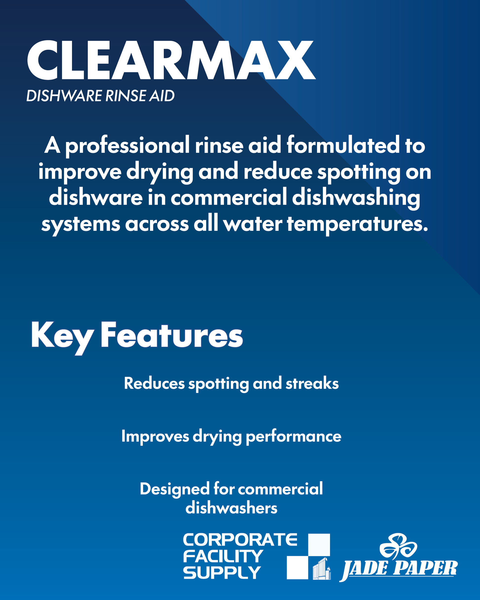 CLEAR-MAX is an all-temperature industrial dishware rinse formulated to deliver spotless, streak-free results in both high- and low-temperature dishwashing machines. Its specialized surfactant blend promotes rapid water sheeting and drying, reducing spots and film on glassware, utensils, and dishes. Designed for heavy-duty commercial use, CLEAR-MAX ensures consistent clarity and shine, even in hard-water conditions.