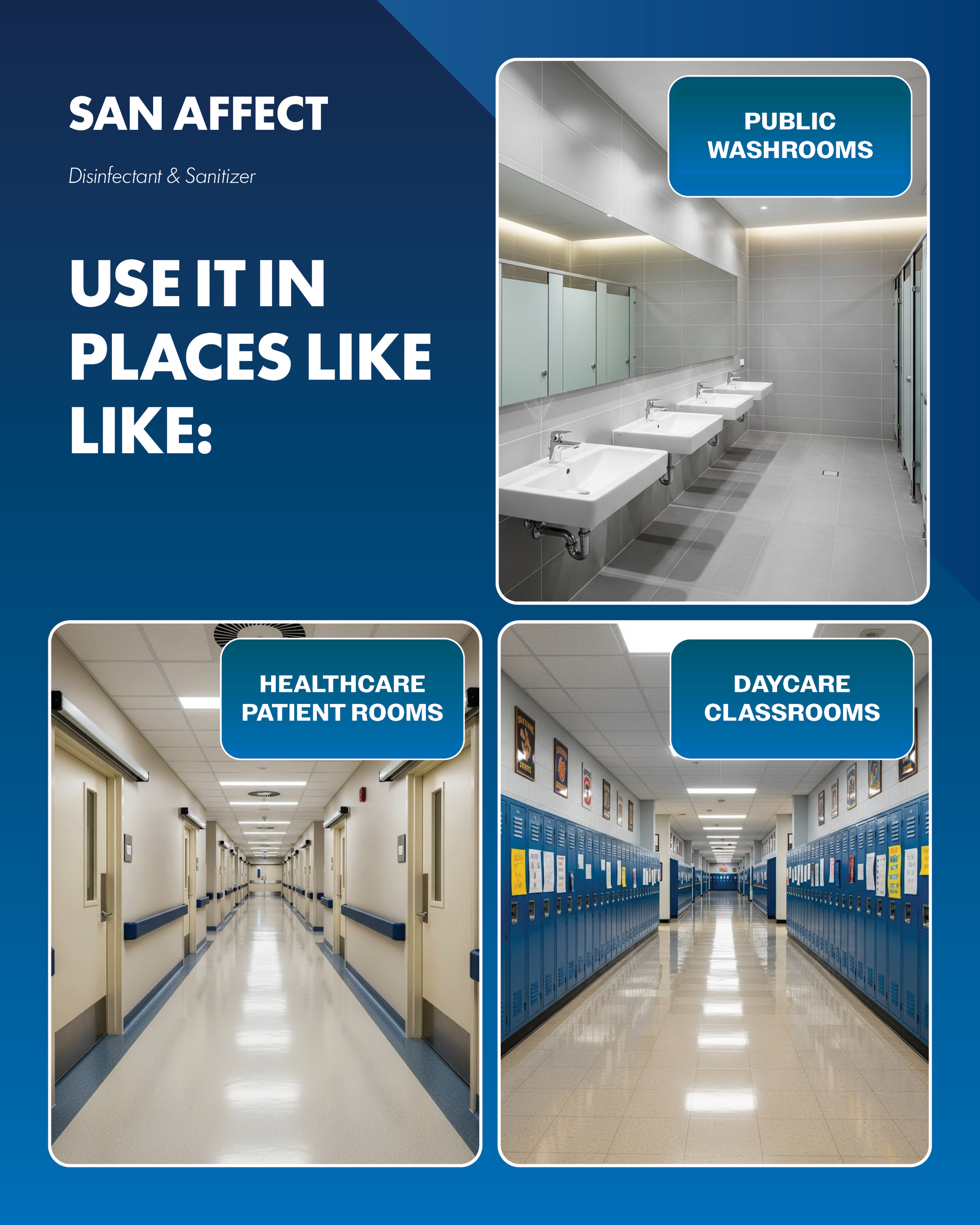 This clear liquid is intended to be diluted and applied by spray, mop, cloth, or sponge, following label directions to ensure proper contact time and disinfection. San Affect is ideal for use in schools, offices, healthcare settings, food service areas (on non-food-contact surfaces), and other facilities where consistent hygiene is essential.