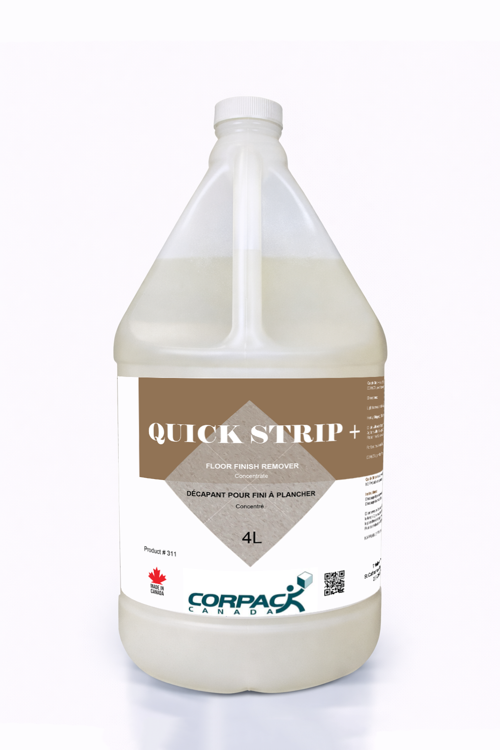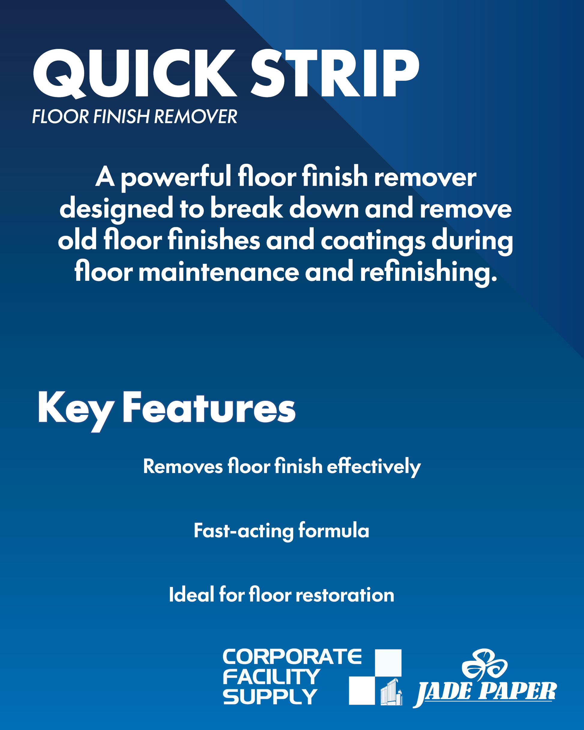 Quick Strip is a powerful floor finish remover designed to break down and lift multiple layers of acrylic and metal-crosslinked floor finishes. Its amine-based formula (including benzyl alcohol and monoethanolamine) penetrates built-up coatings quickly, softening stubborn films so they can be easily scrubbed and rinsed away.
