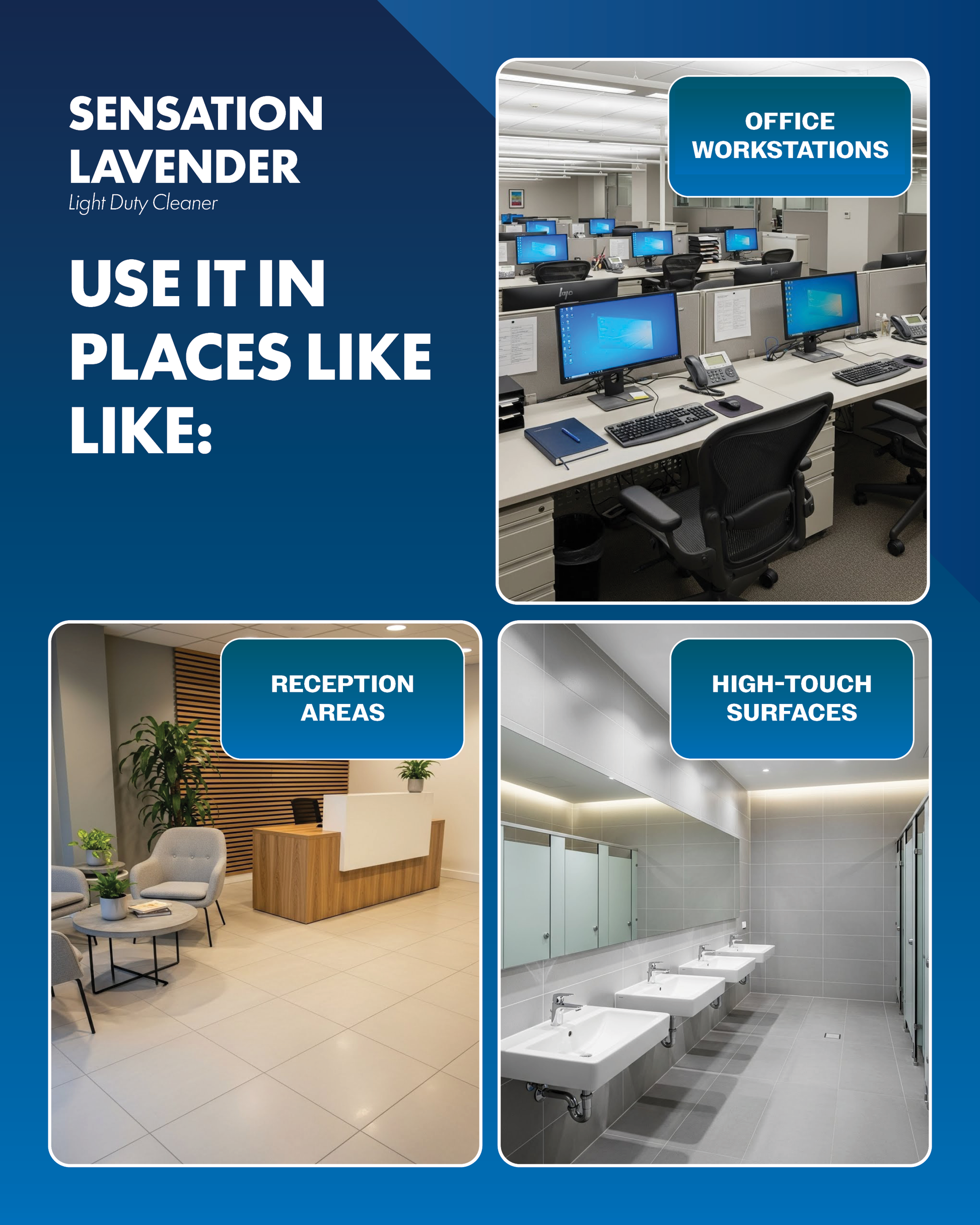 Sensation Lavender is a light-duty scented cleaner designed for everyday maintenance and routine surface cleaning. Formulated with mild nonionic surfactants and a small amount of isopropyl alcohol, it removes light soils, dust, and general residues while leaving a clean, calming lavender fragrance throughout treated areas.